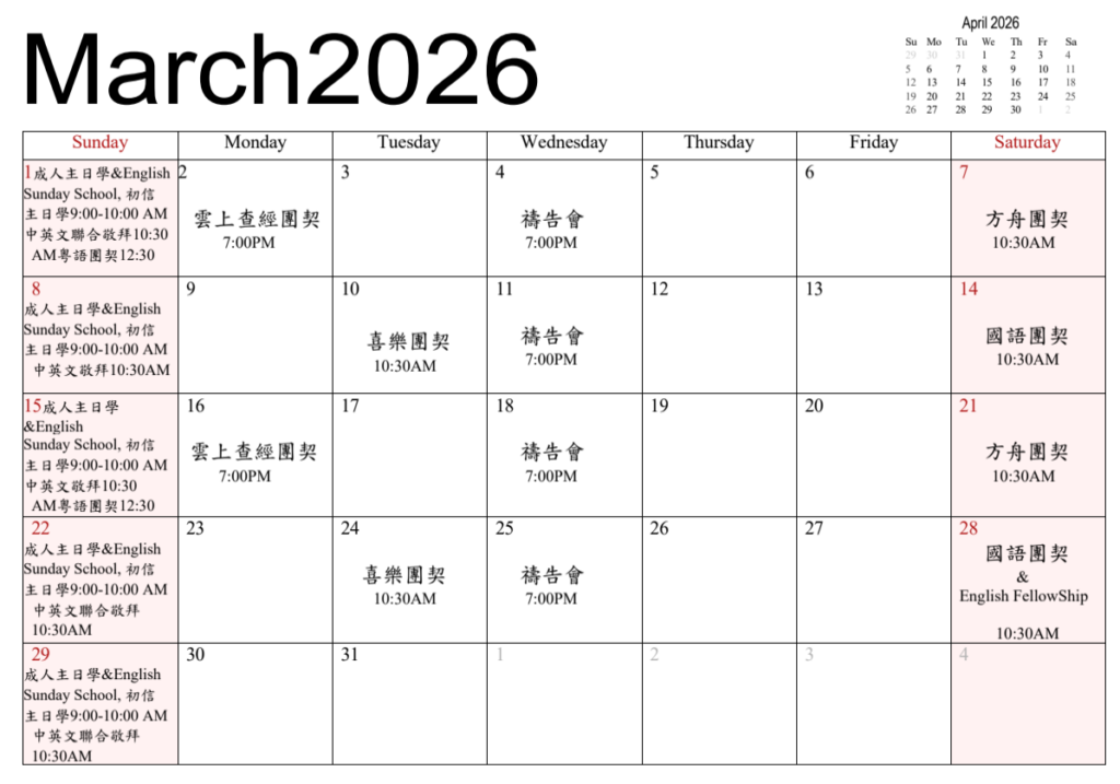 2026 3 月份團契和聚會時間